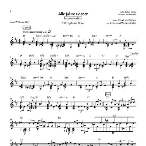 A “jazzy” arrangement of the Austrian Christmas carol for solo vibraphone. This piece is recorded on the CD and contained in the collection Alle Jahre Vibra.