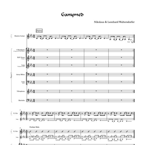 This composition has been played by Duo Waltersdorfer. The piece consists mainly of a loop vamp which is gradually built up. Player 1 is playing E-Guitar and managing the loop station, while player 2 is playing various percussion instruments.